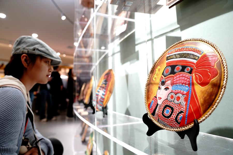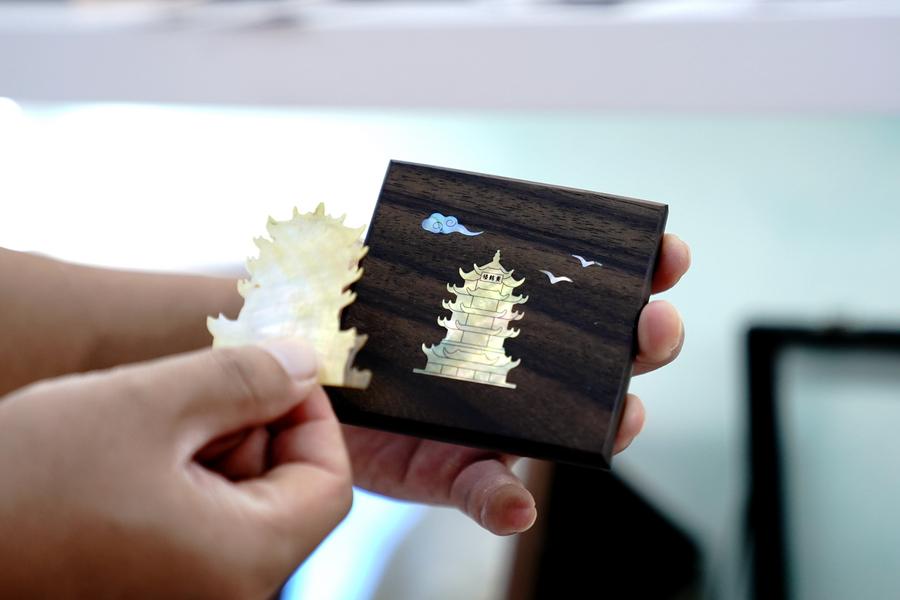 7日、輸入博の湖北省エリアにある無形文化遺産に登録されている武漢の螺鈿(らでん)象眼工芸品。(上海=新華社記者/張建松)