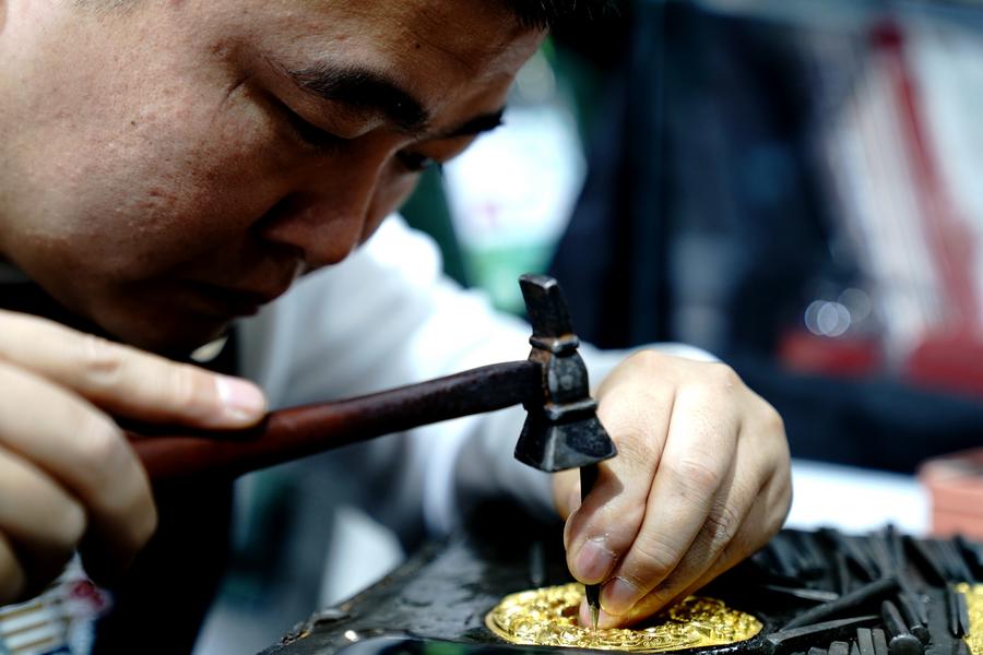 7日、輸入博の浙江省エリアで無形文化遺産に登録されている技法を使って金の装飾品を制作する職人。(上海=新華社記者/張建松)