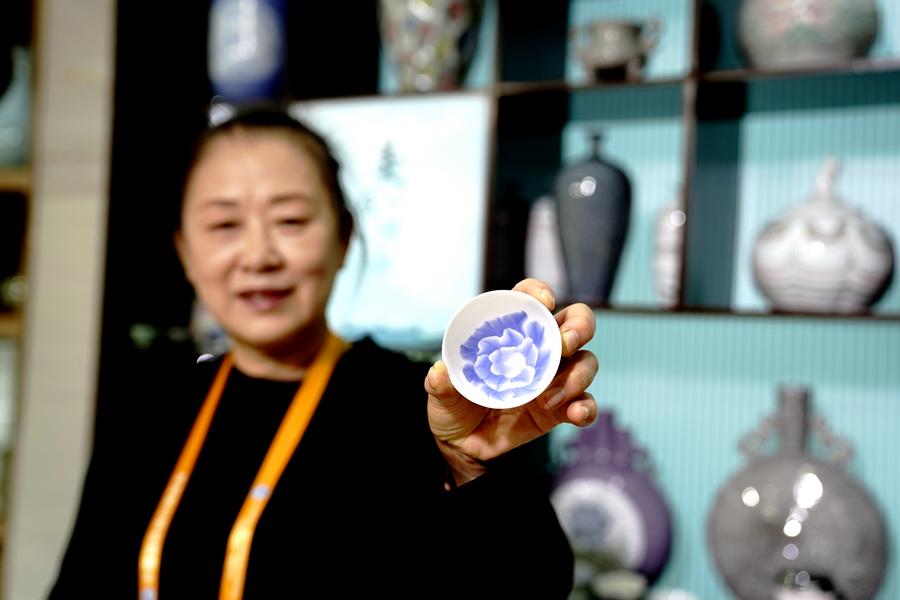 7日、輸入博の河南省エリアで無形文化遺産に登録されている金谷軒絞胎瓷を紹介する出展者。(上海=新華社記者/張建松)