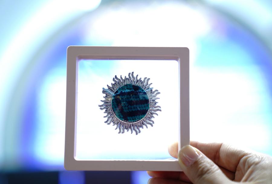 7日、輸入博の湖北省エリアに展示された国家級無形文化遺産に登録されているトゥチャ族の絹織物「西蘭卡普(シランカプ)」を使ったブローチ。(上海=新華社記者/張建松)