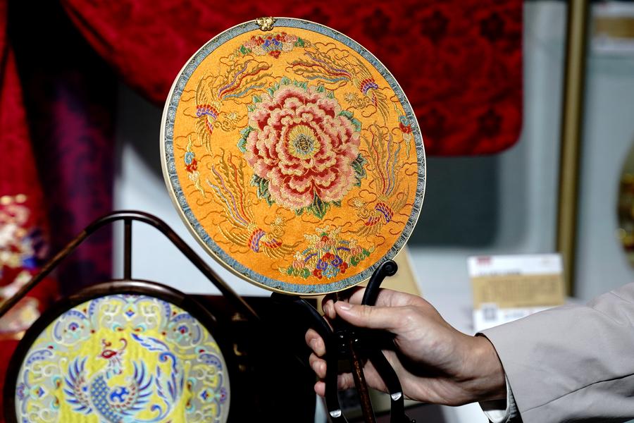 7日、輸入博の江蘇省エリアで蘇州の伝統刺繍(ししゅう)「蘇繍」の技法を来場者に披露する職人。(上海=新華社記者/張建松)