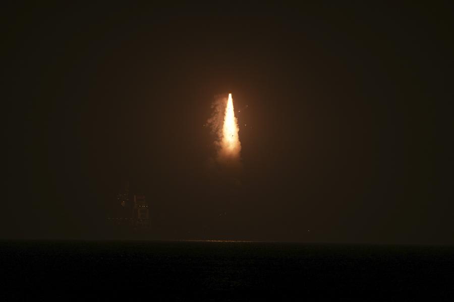 9日、山東省海陽市沖から打ち上げられる運搬ロケット「長征11号遥6」。(海陽=新華社配信/郭金祺)