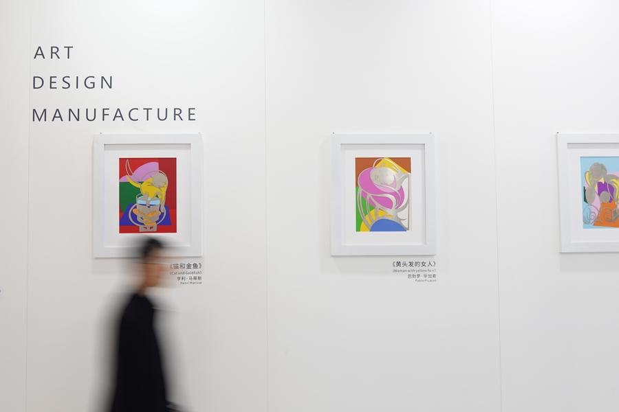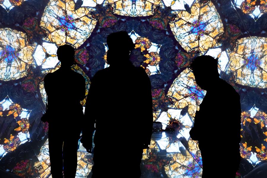 6日、東湖ハイテク開発区にある華工科技レーザー科学館で、レーザー技術を応用して制作した絵画の前を歩く来場者。(武漢=新華社記者/戴明軒)
