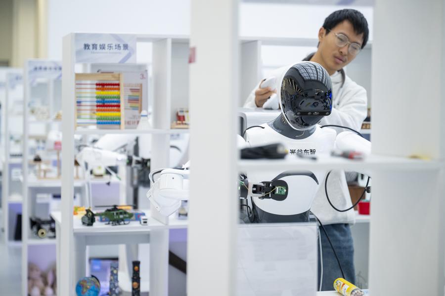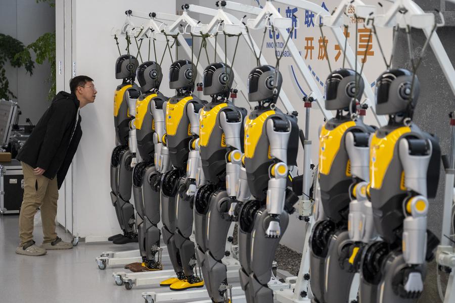 6日、東湖ハイテク開発区にある湖北人型ロボットイノベーションセンターで、ロボットのデータを収集するスタッフ。(武漢=新華社記者/伍志尊)
