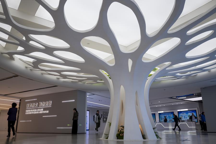6日、東湖ハイテク開発区にある中国建築科学技術館を見学する来場者。(武漢=新華社記者/戴明軒)