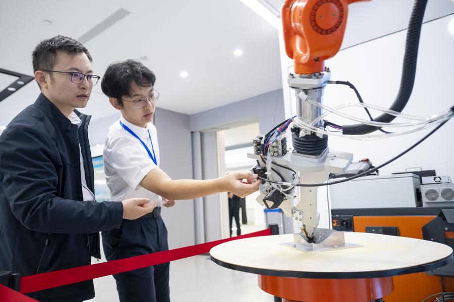 6日、東湖ハイテク開発区にある武漢産業イノベーション発展研究院で、付加製造ロボットを披露するスタッフ。(武漢=新華社記者/伍志尊)