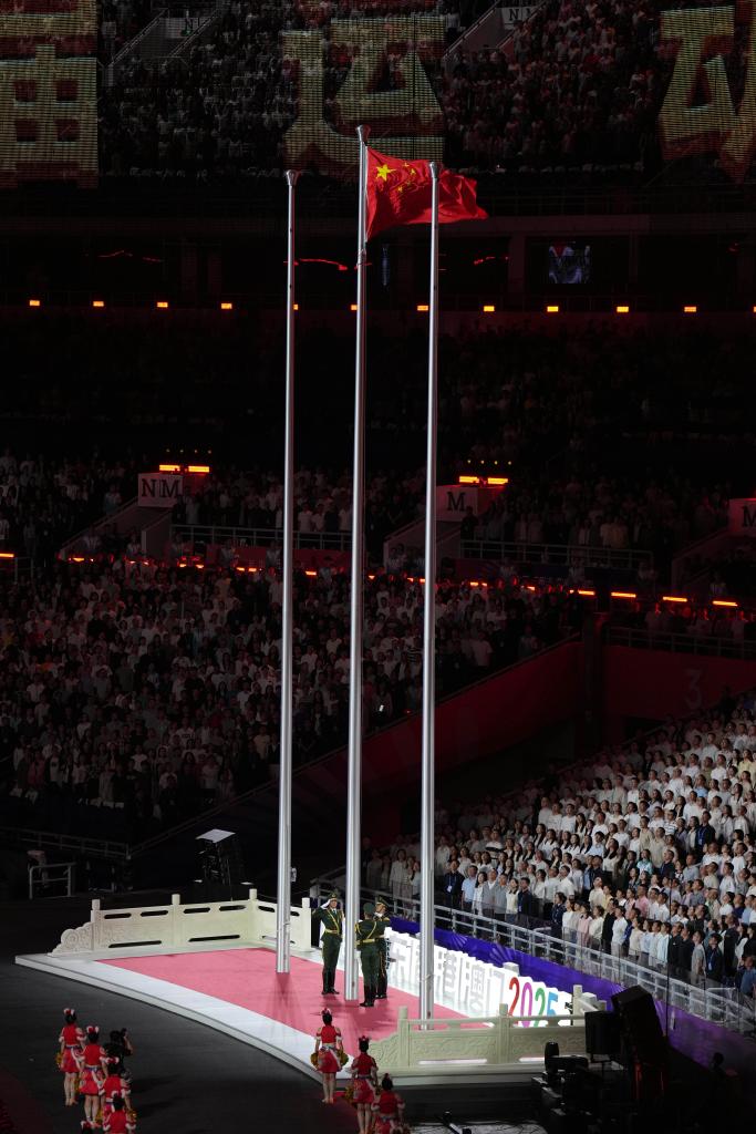 9日、第15回全国運動会の開会式で行われた国旗掲揚式。(広州=新華社記者/黄偉)