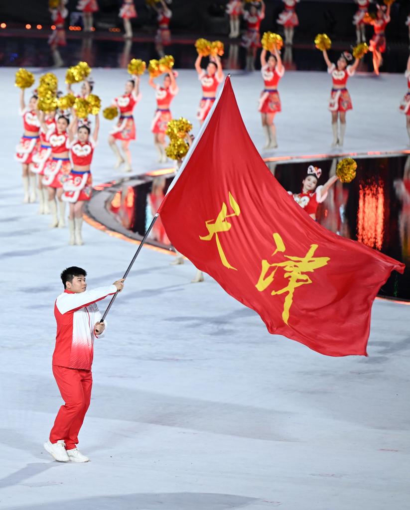 9日、第15回全国運動会の開会式で、天津市代表団の旗手を務める劉煥華(りゅう・かんか)。(広州=新華社記者/楊冠宇)