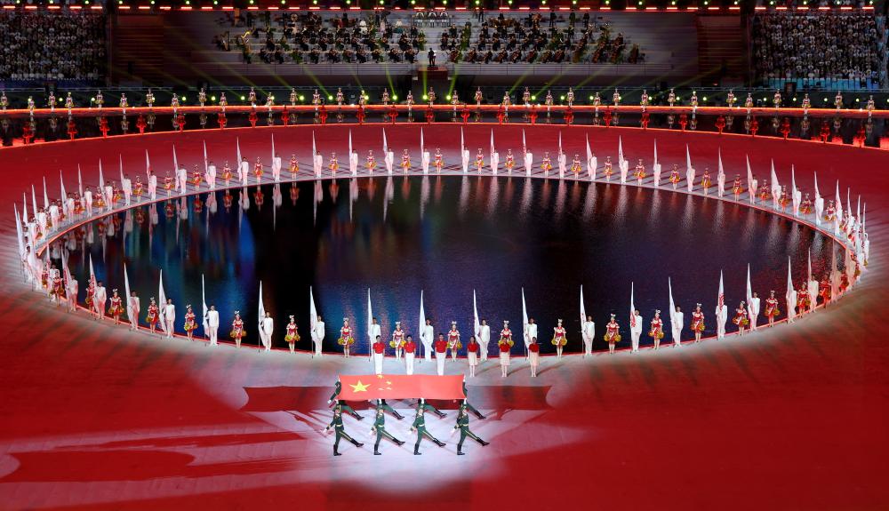 9日、第15回全国運動会の開会式で入場する中国国旗。(広州=新華社記者/盧漢欣)
