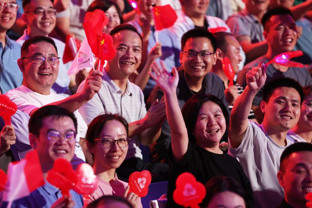 9日、第15回全国運動会の開会式で、観客席から声援を送る人たち。(広州=新華社記者/雒円)