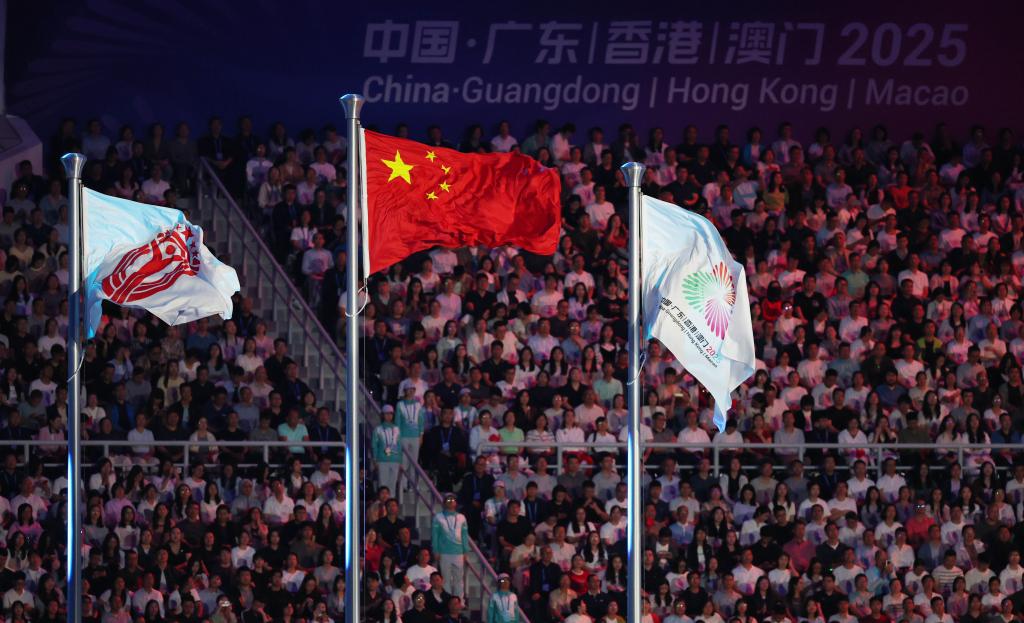9日、第15回全国運動会の開会式で掲揚された中国国旗。(広州=新華社記者/薛宇舸)