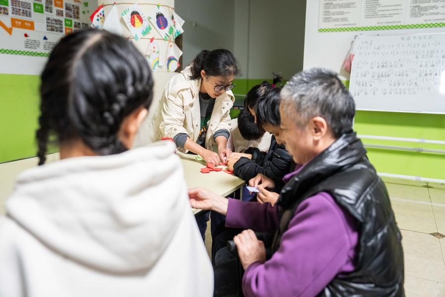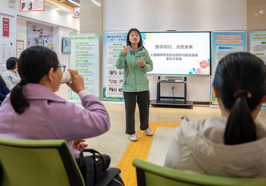 6日、長沙市望城区の湘陵社区で、知的障害のある学生の保護者を指導するボランティア(中央)。(長沙=新華社記者/陳思汗)