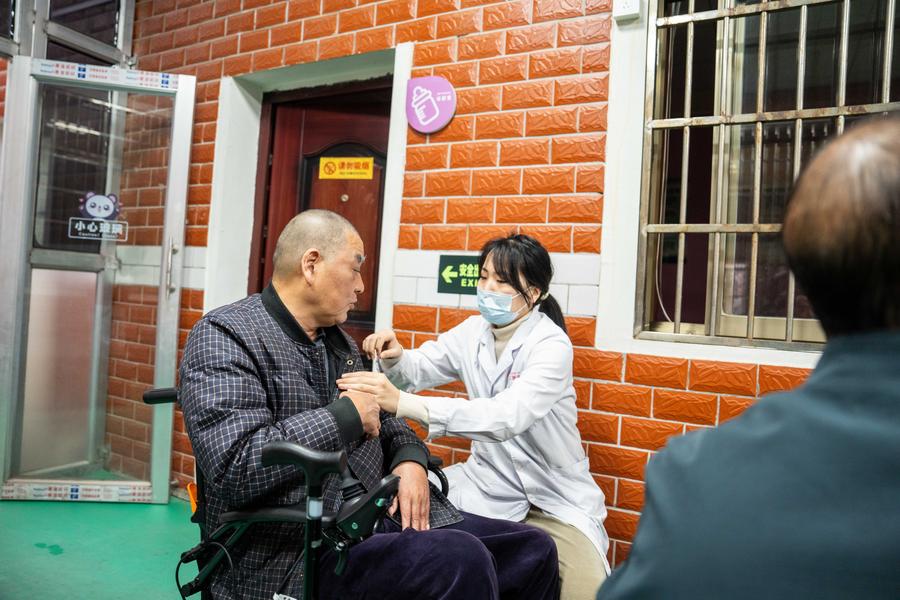 6日、長沙市望城区の中南社区で、体の不自由な住民の健康診断を行う医療スタッフ。(長沙=新華社記者/陳思汗)