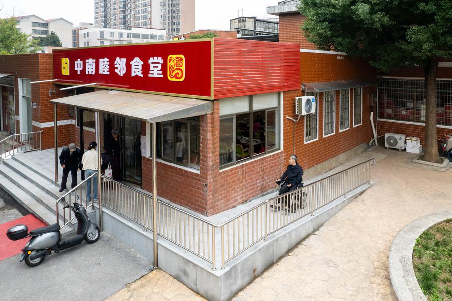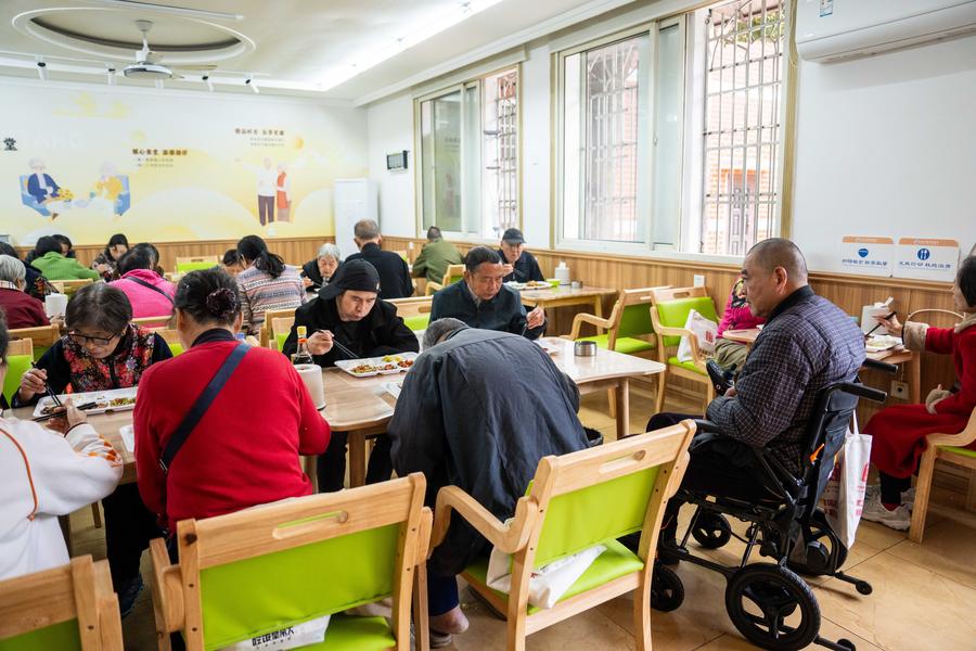 6日、長沙市望城区の中南社区にある食堂で食事をする高齢者と障害者。(長沙=新華社記者/陳思汗)