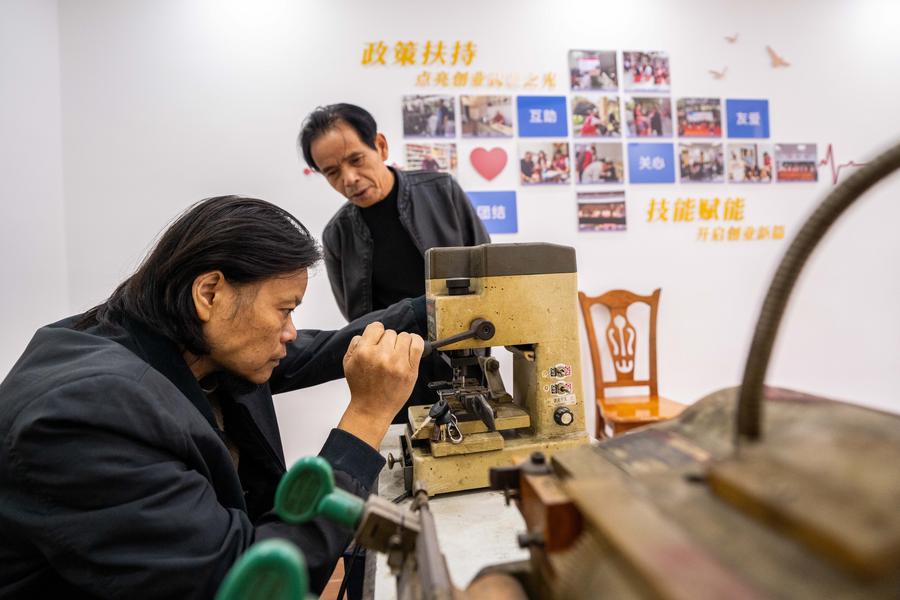 6日、長沙市望城区の中南社区にある無料のサポートスペースで鍵を作る体の不自由な住民(左)。(長沙=新華社記者/陳思汗)