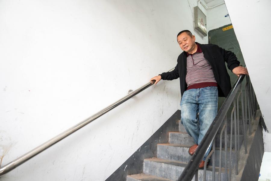 6日、長沙市望城区の中南社区で、改修を済ませた階段の手すりを使う住民。(長沙=新華社記者/陳思汗)