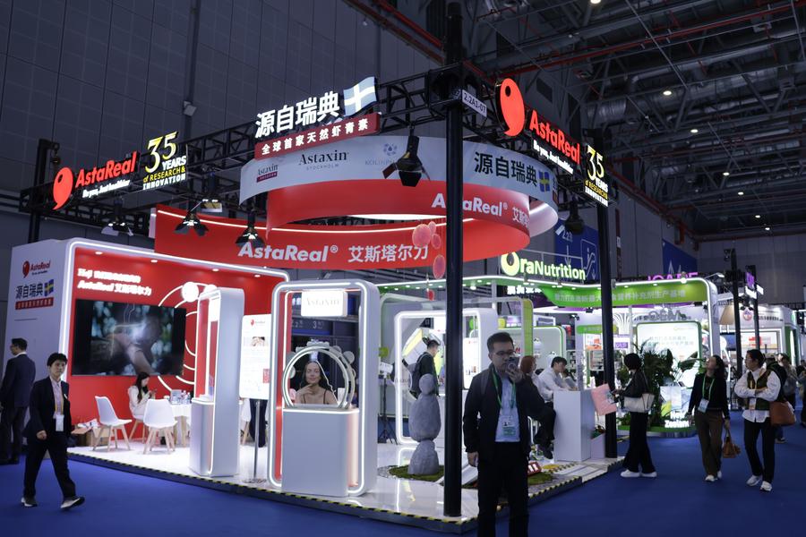 7日、第8回中国国際輸入博覧会に出展したスウェーデン天然アスタキサンチンメーカー「アスタリール」のブース。(上海=新華社記者/藍建中)