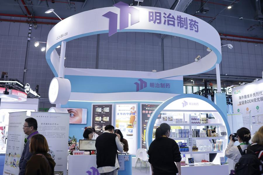 7日、第8回中国国際輸入博覧会の明治製薬ブース。(上海=新華社記者/藍建中)