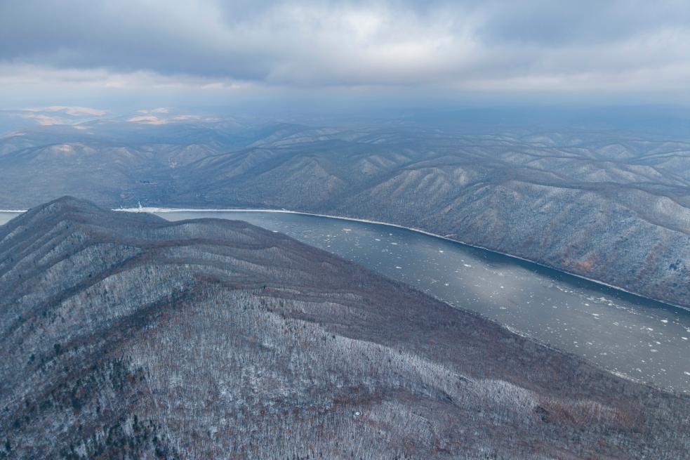 6日、国道331号線蘿北区間に位置する「竜江三峡」。黒竜江流域で最も景観が美しい場所として知られる。(ドローンから、鶴崗=新華社記者/謝剣飛)