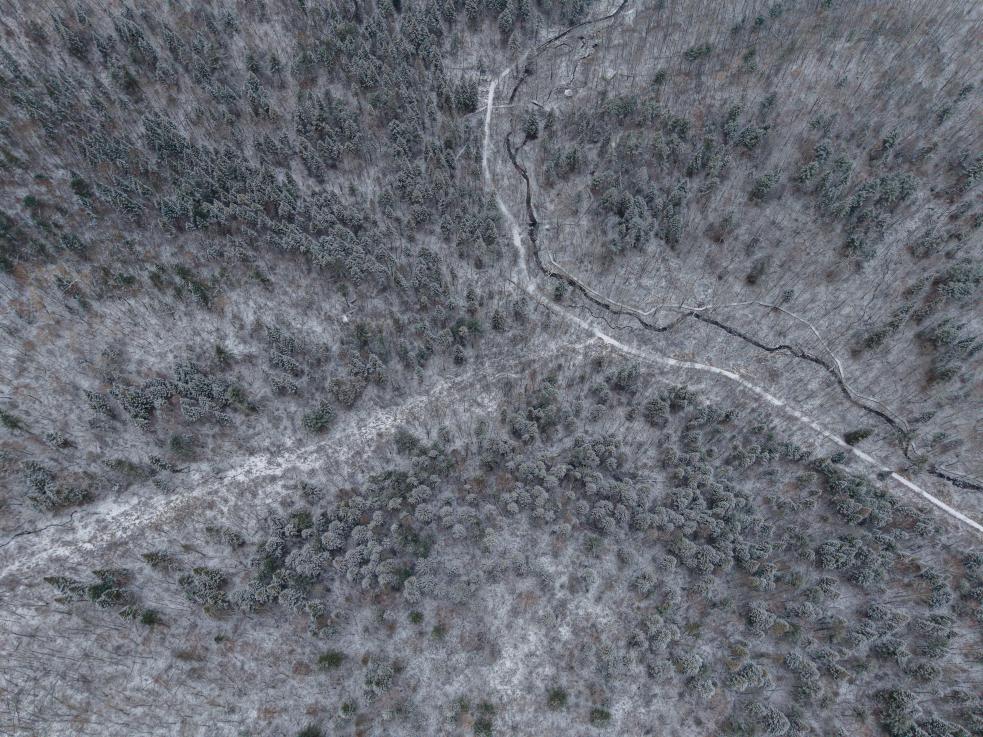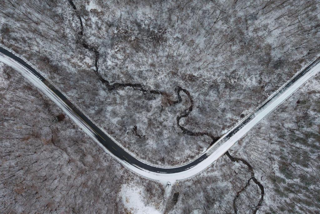 6日、雪化粧した国道331号線蘿北区間沿線。(ドローンから、鶴崗=新華社記者/謝剣飛)