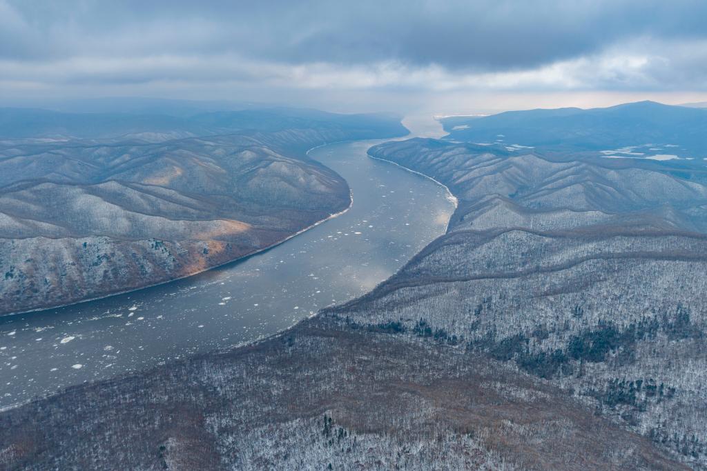 6日、国道331号線蘿北区間で見られた黒竜江の流氷。(ドローンから、鶴崗=新華社記者/謝剣飛)