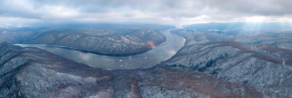 6日、国道331号線蘿北区間に位置する「竜江三峡」。黒竜江流域で最も景観が美しい場所として知られる。(パノラマ写真、ドローンから、鶴崗=新華社記者/謝剣飛)