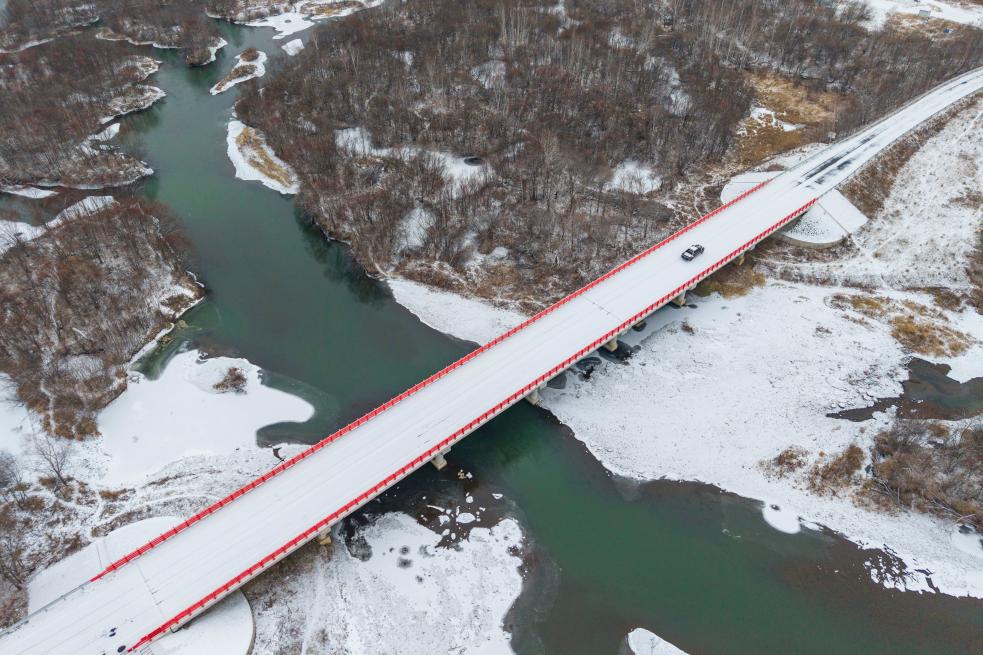 6日、国道331号線嘉蔭区間と蘿北区間の境にある嘉蔭河大橋。(ドローンから、鶴崗=新華社記者/謝剣飛)