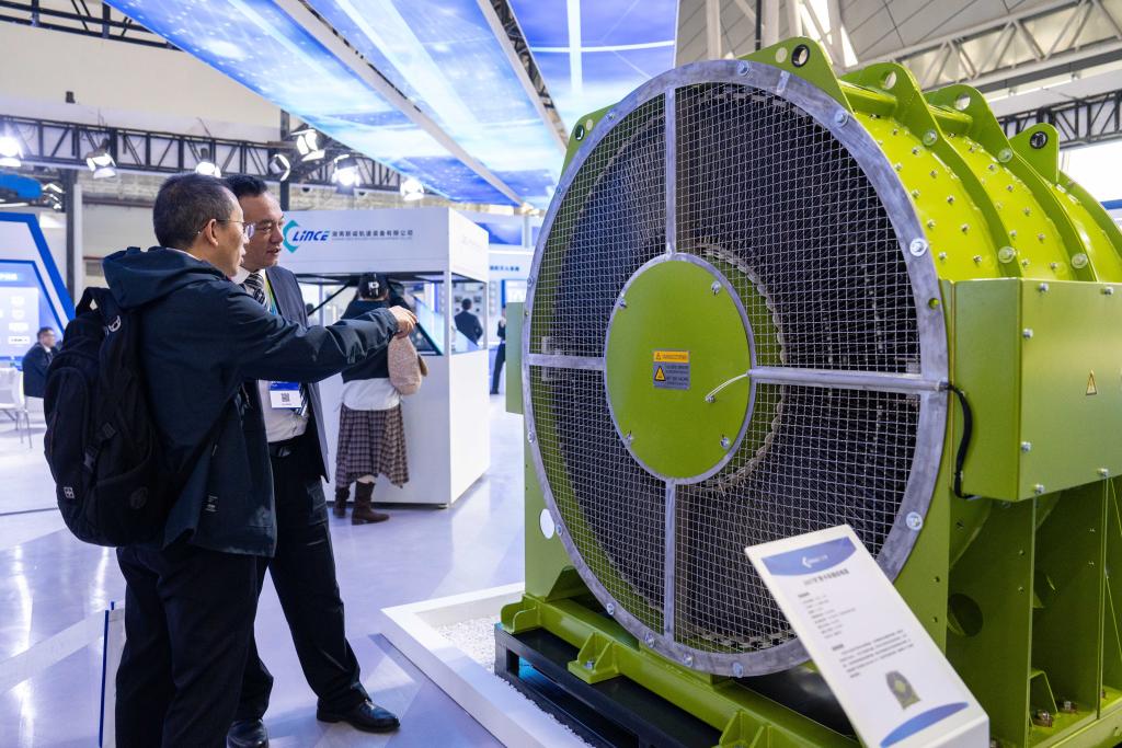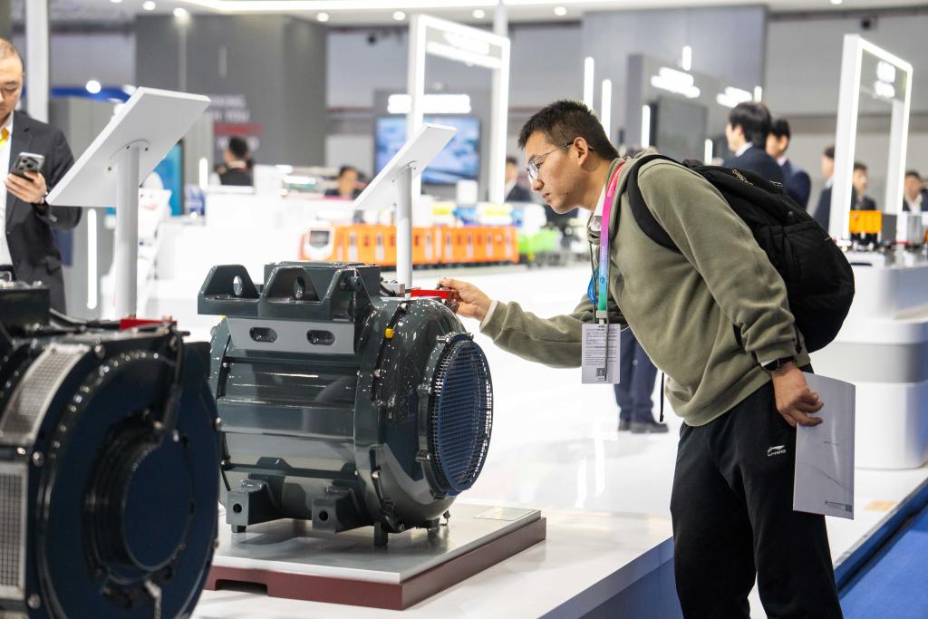7日、地下鉄用の永久磁石式けん引モーターを見学する来場者。(長沙=新華社記者/陳思汗)