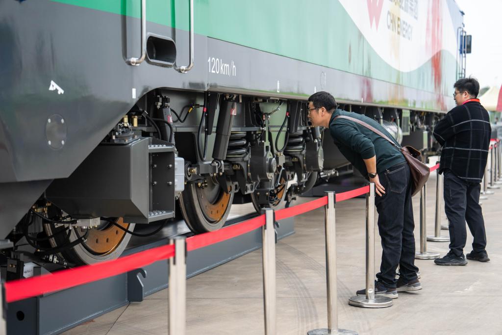 7日、列車の台車を見学する来場者。(長沙=新華社記者/陳思汗)