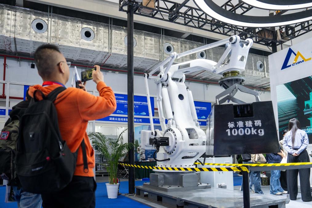 7日、重荷重用の産業ロボットを撮影する来場者。(長沙=新華社記者/陳思汗)