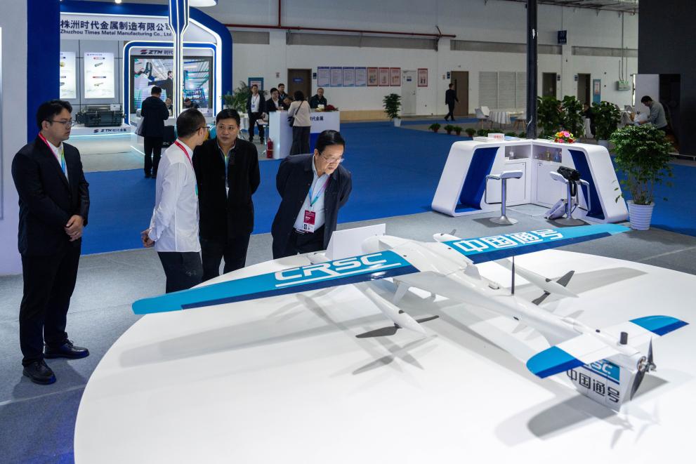 7日、炭素繊維複合材製ドローンを見学する来場者。(長沙=新華社記者/陳思汗)