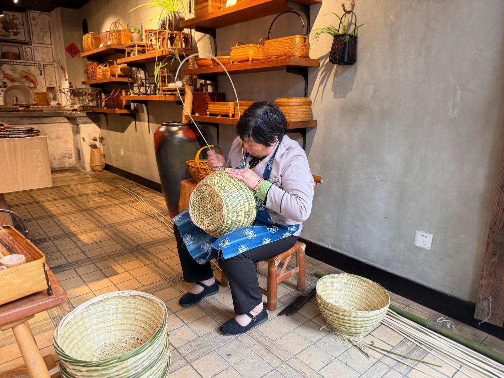 7日、浙江省無形文化遺産の烏鎮竹編みを作る職人。(烏鎮=新華社記者/陳雨寧)
