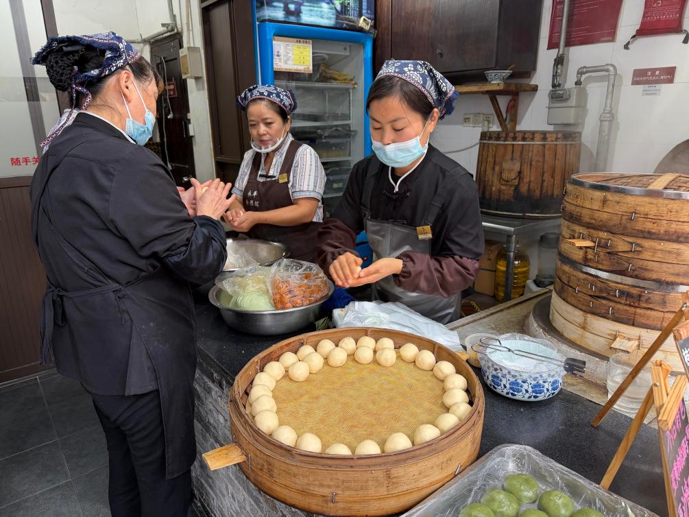 7日、烏鎮にある小吃(軽食)の店で、卵黄肉鬆団子(塩卵や肉でんぶをあんにした米粉団子)を作る従業員。(烏鎮=新華社記者/陳雨寧)