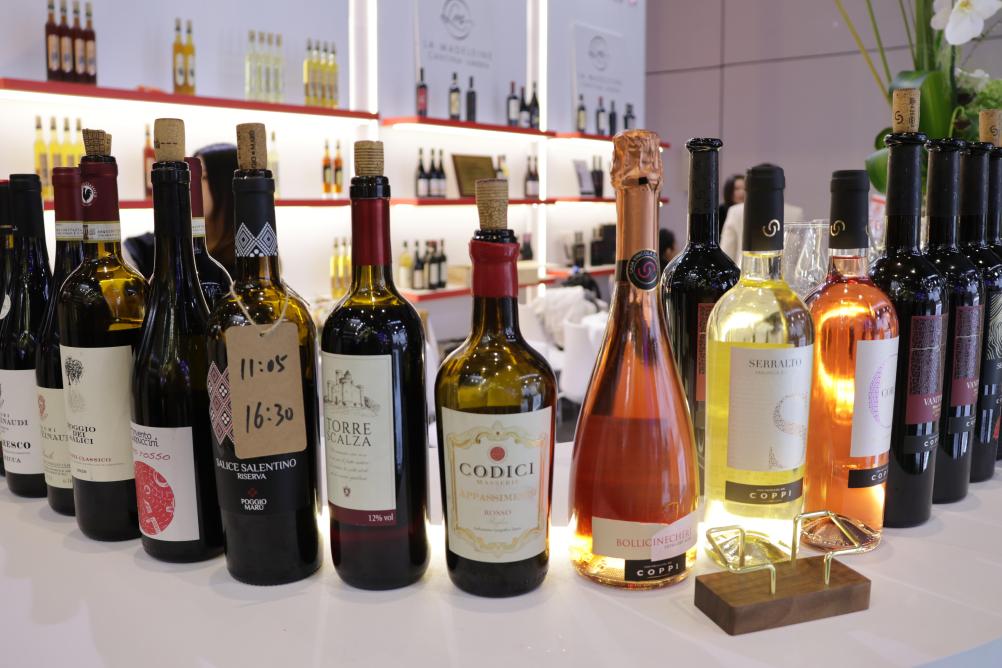 8日、第8回中国国際輸入博覧会の食品・農業製品エリアに展示されたカナダ産ワイン。(上海=新華社記者/藍建中)