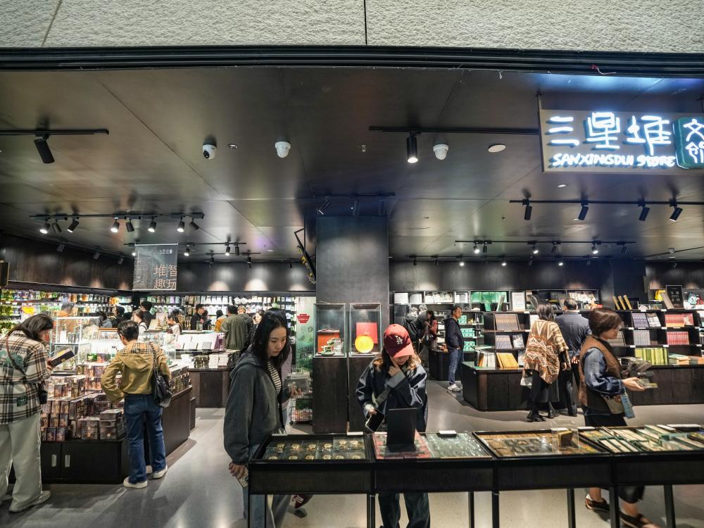 10月30日、四川省広漢市の三星堆博物館のミュージアムショップで商品を選ぶ来館者。(成都=新華社記者/王曦)
