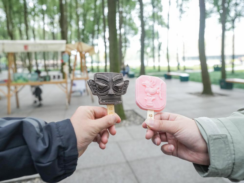 10月30日、四川省広漢市の三星堆博物館で、三星堆遺跡から出土した文化財をモチーフにしたアイスクリームを手にする観光客。(成都=新華社記者/王曦)