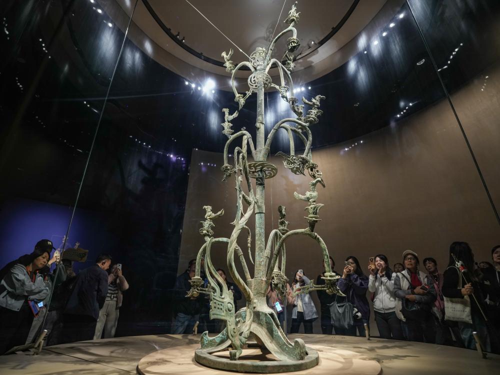 10月30日、四川省広漢市の三星堆博物館で、青銅神樹を見学する来館者。(成都=新華社記者/王曦)