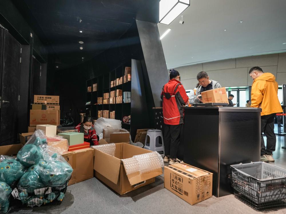 10月30日、四川省広漢市の三星堆博物館のミュージアムショップで、来館者が購入した商品を梱包し発送するスタッフ。(成都=新華社記者/王曦)