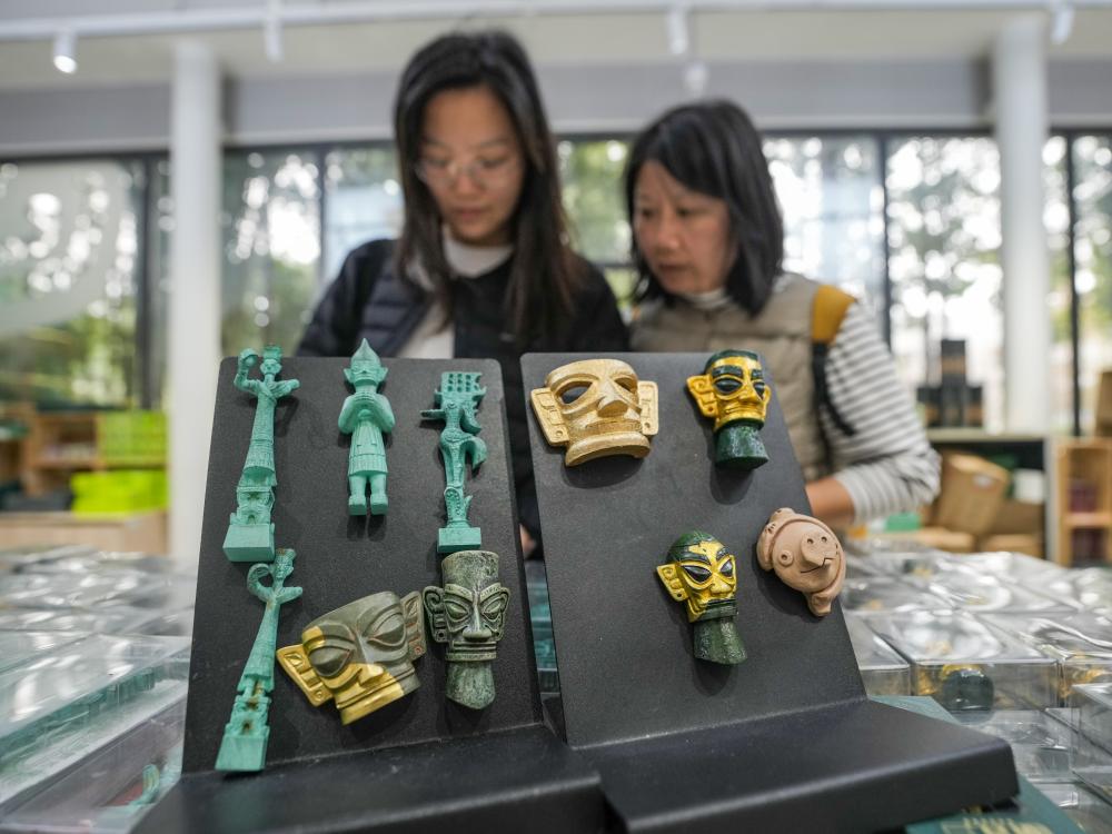 【新華社成都11月11日】中国四川省広漢市の三星堆(さんせいたい)遺跡ではここ数年、重要な考古学的発見や成果が続々と公開、展示され、それに伴い三星堆博物館のミュージアムグッズも好調な売れ行きを見せている。遺跡から出土した黄金仮面や青銅器などをモチーフにした商品も登場し、人気を集めている。