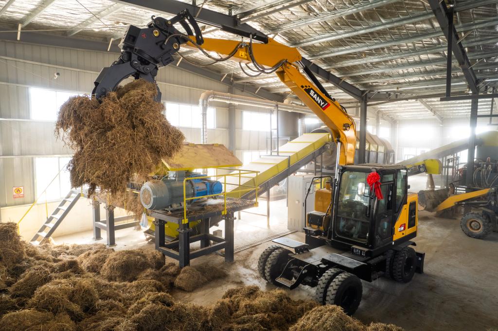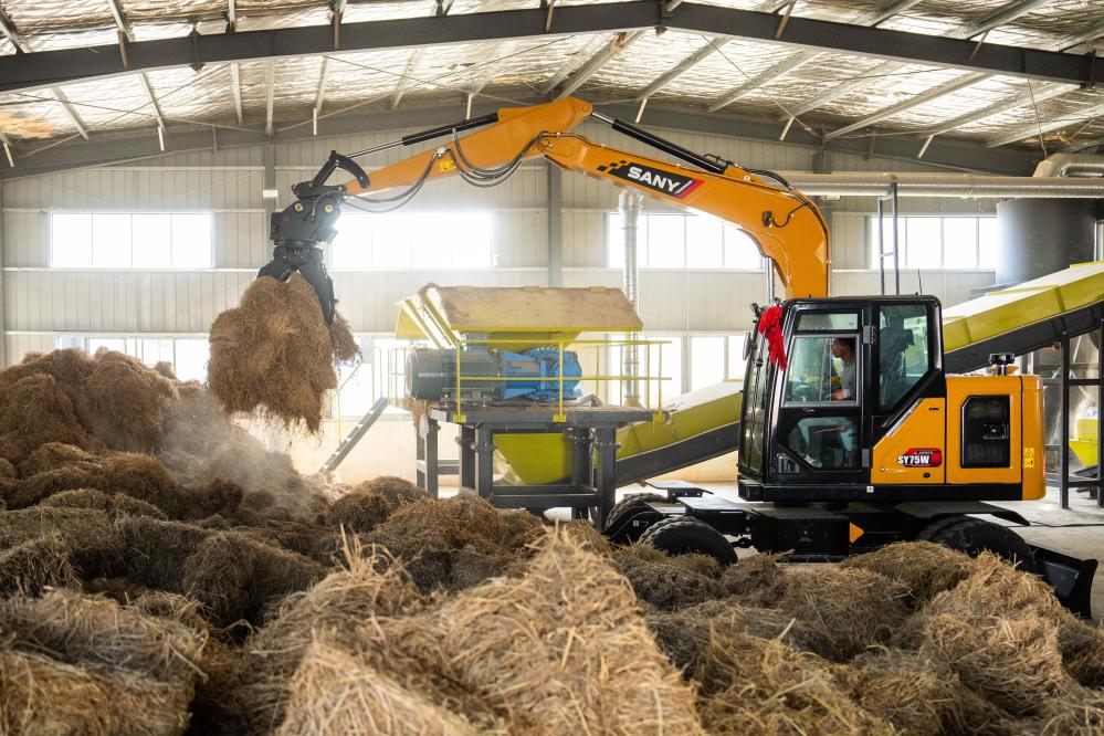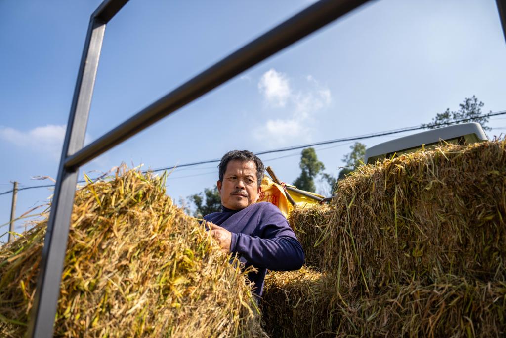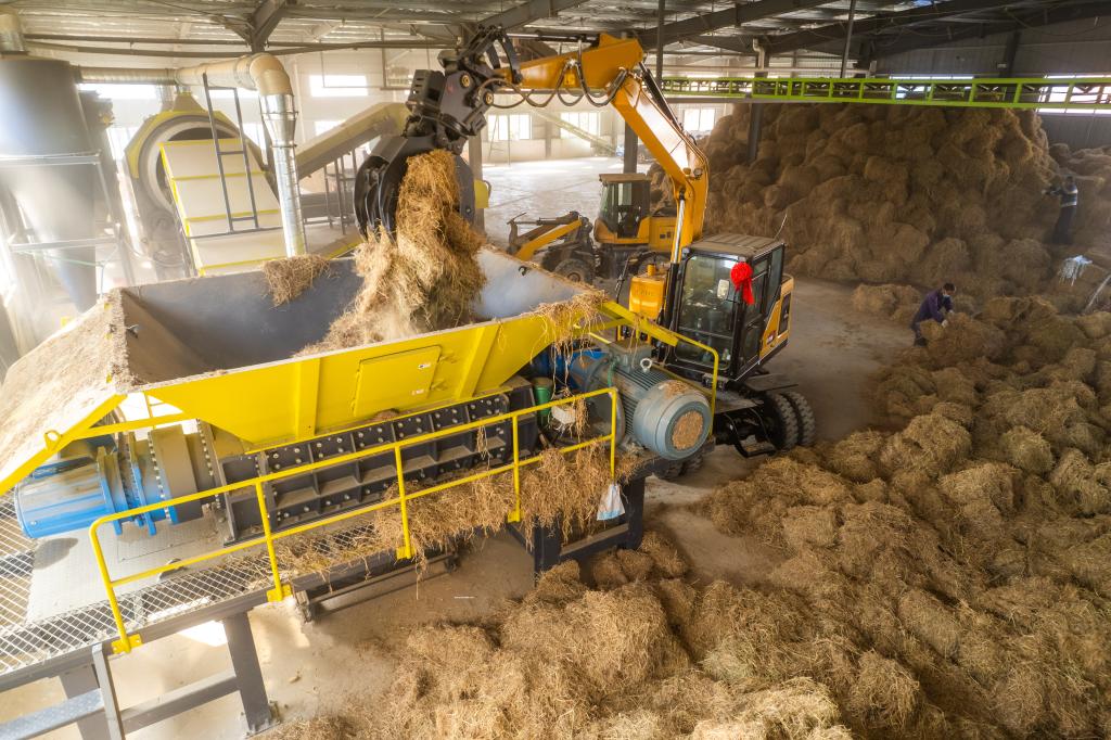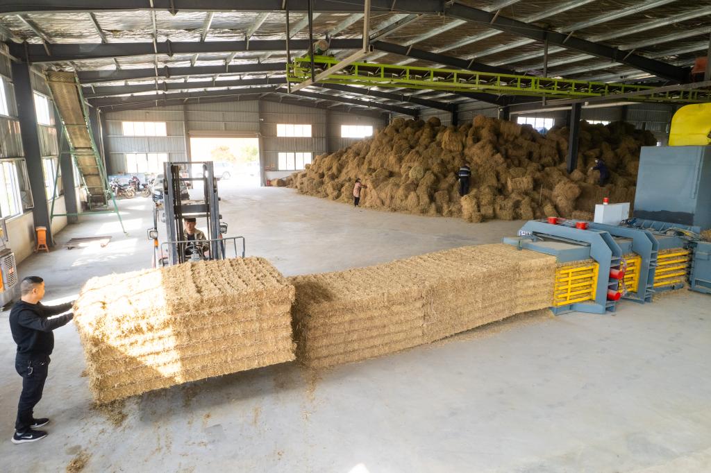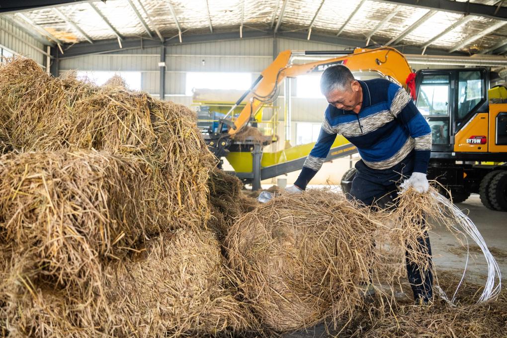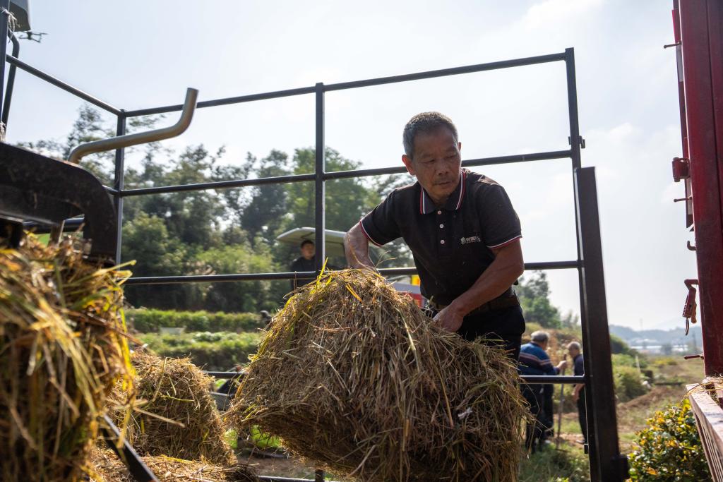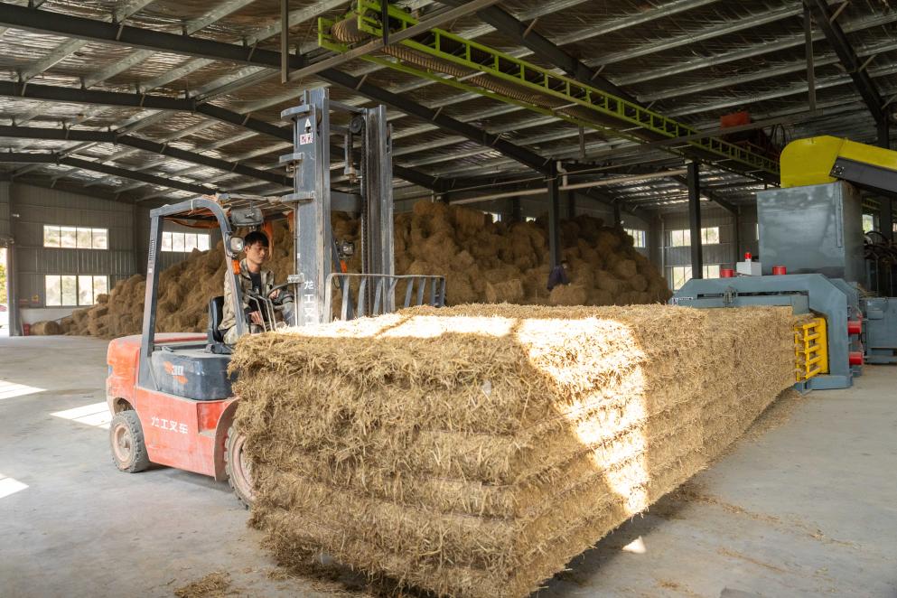 5日、長沙県開慧鎮にある飼料加工場で稲わらを整理する作業員。(長沙=新華社記者/陳思汗)