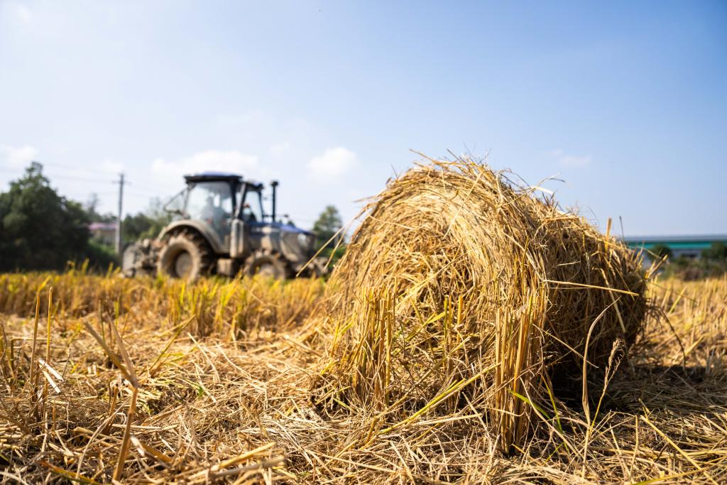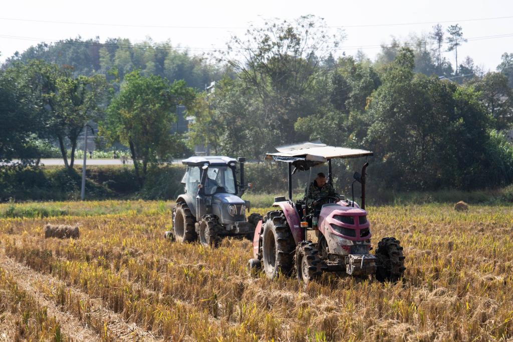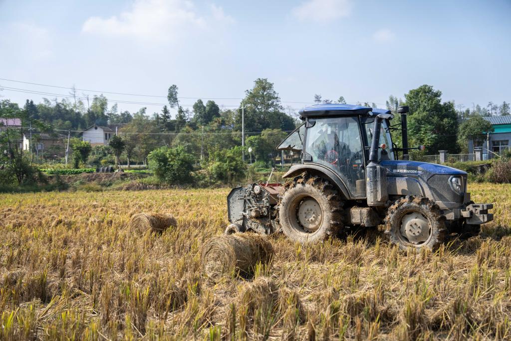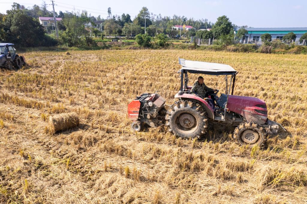 5日、長沙県開慧村で牽引式結束機を運転し、稲わらを回収する村民。(長沙=新華社記者/陳思汗)