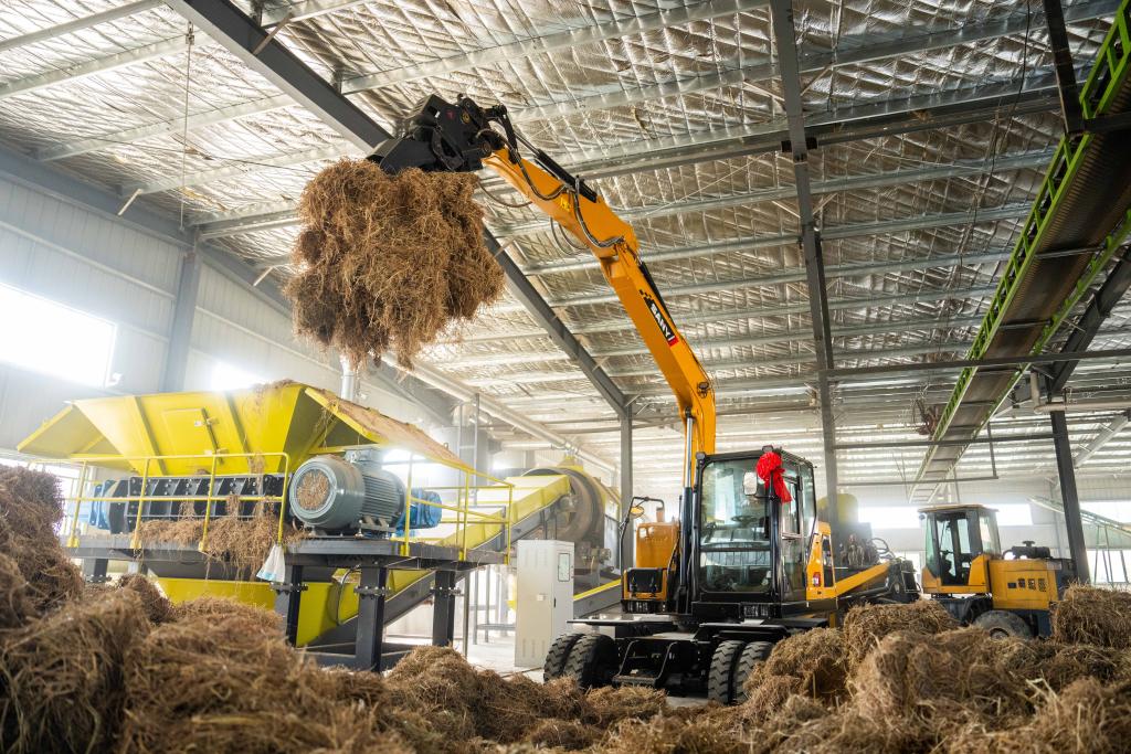 5日、長沙県開慧鎮にある飼料加工場で稲わらを設備に投入する作業員。(長沙=新華社記者/陳思汗)