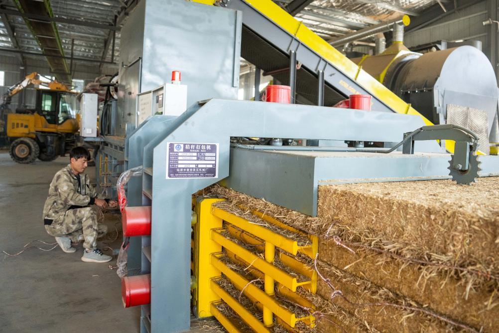5日、長沙県開慧鎮にある飼料加工場で結束機を操作する作業員。(ドローンから、長沙=新華社記者/陳思汗)