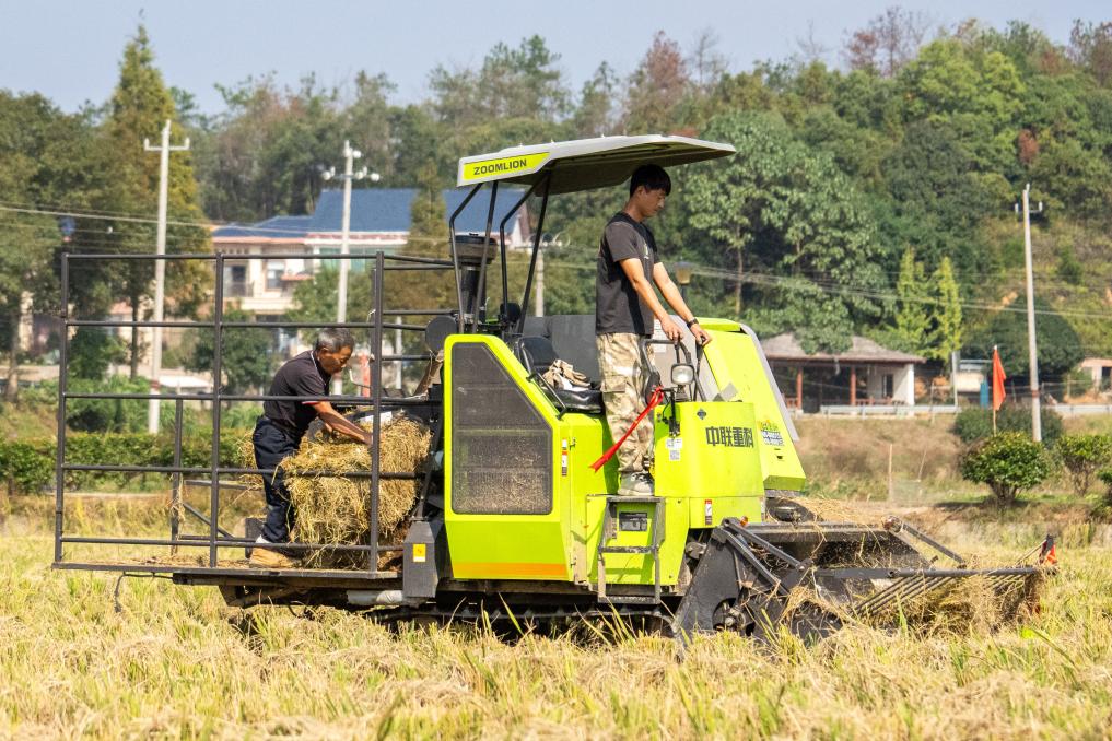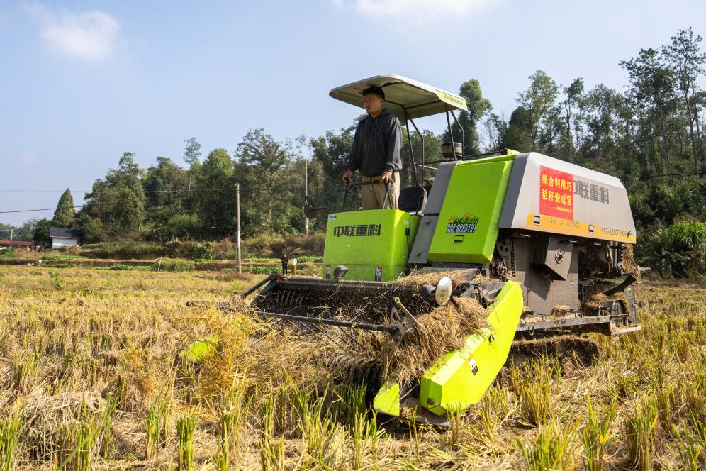 5日、長沙県開慧村で自走式結束機を運転し、稲わらを回収する村民。(長沙=新華社記者/陳思汗)