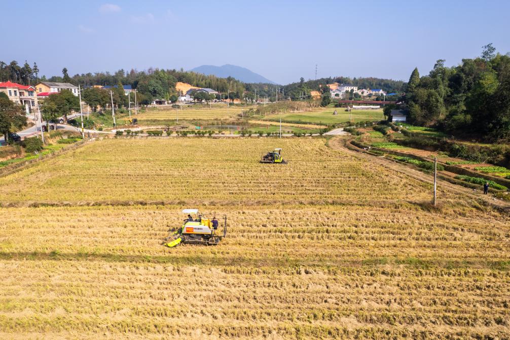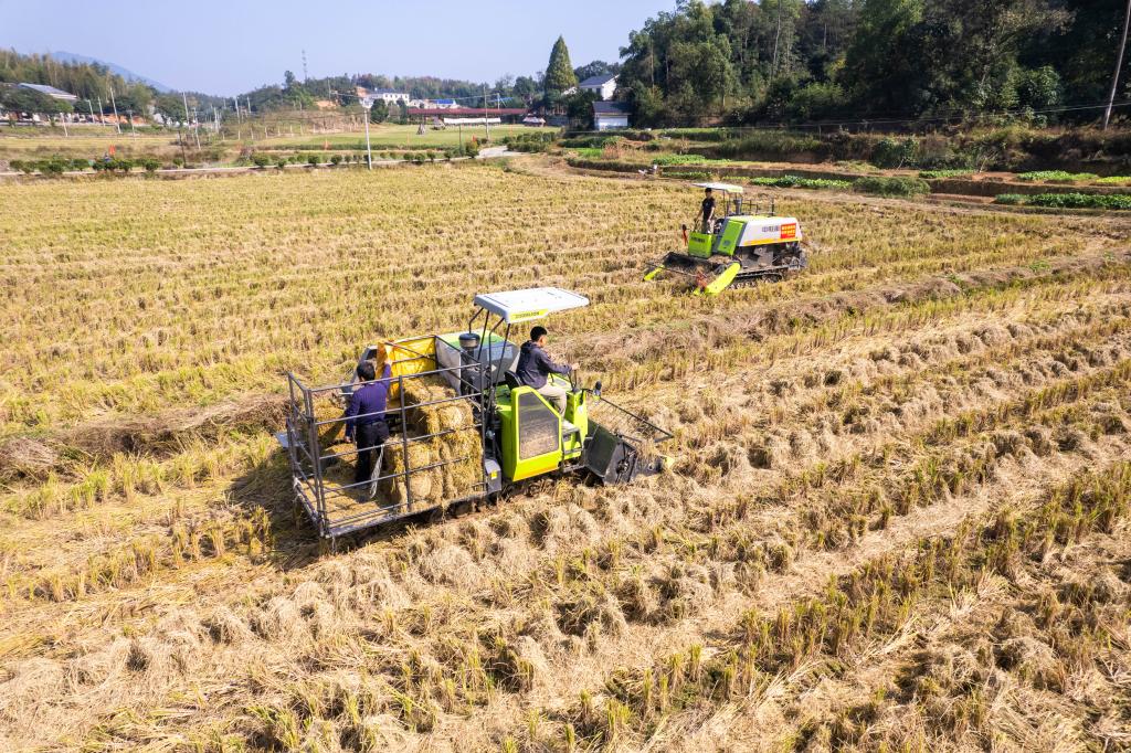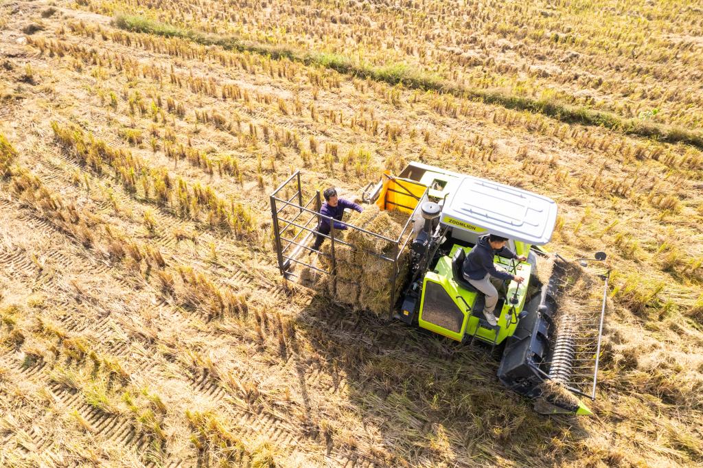 5日、長沙県開慧村で自走式結束機を運転し、稲わらを回収する村民。(ドローンから、長沙=新華社記者/陳思汗)