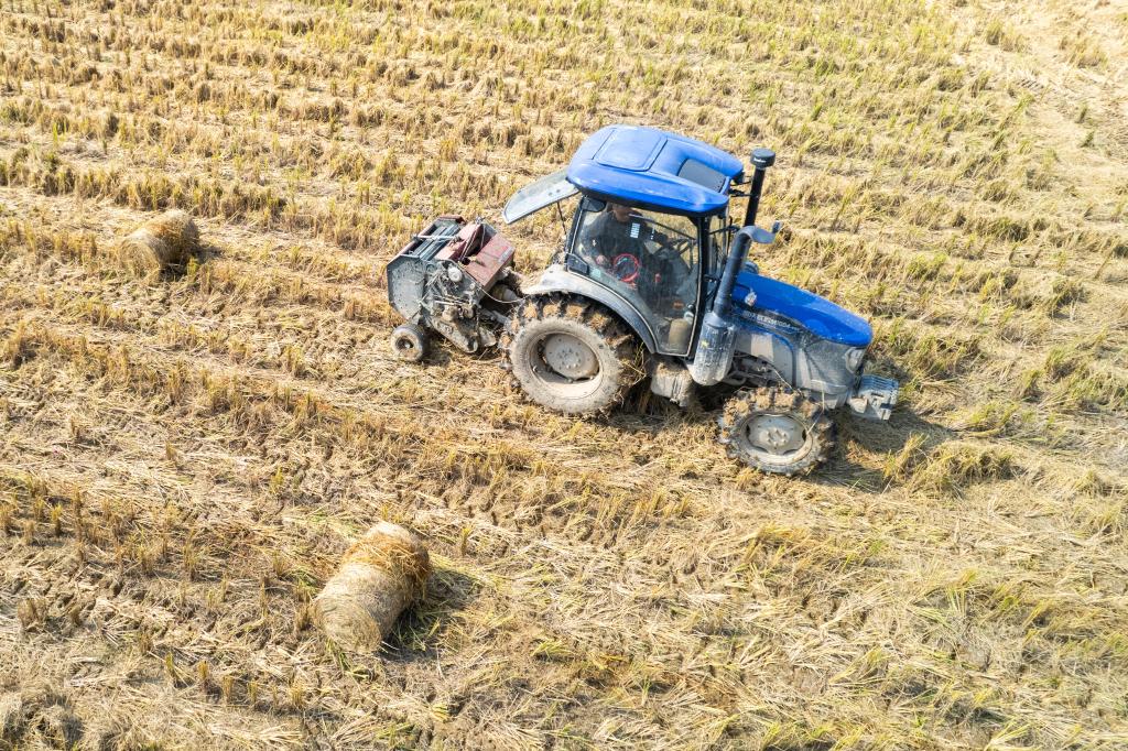 5日、長沙県開慧村で牽引式結束機を運転し、稲わらを回収する村民。(ドローンから、長沙=新華社記者/陳思汗)