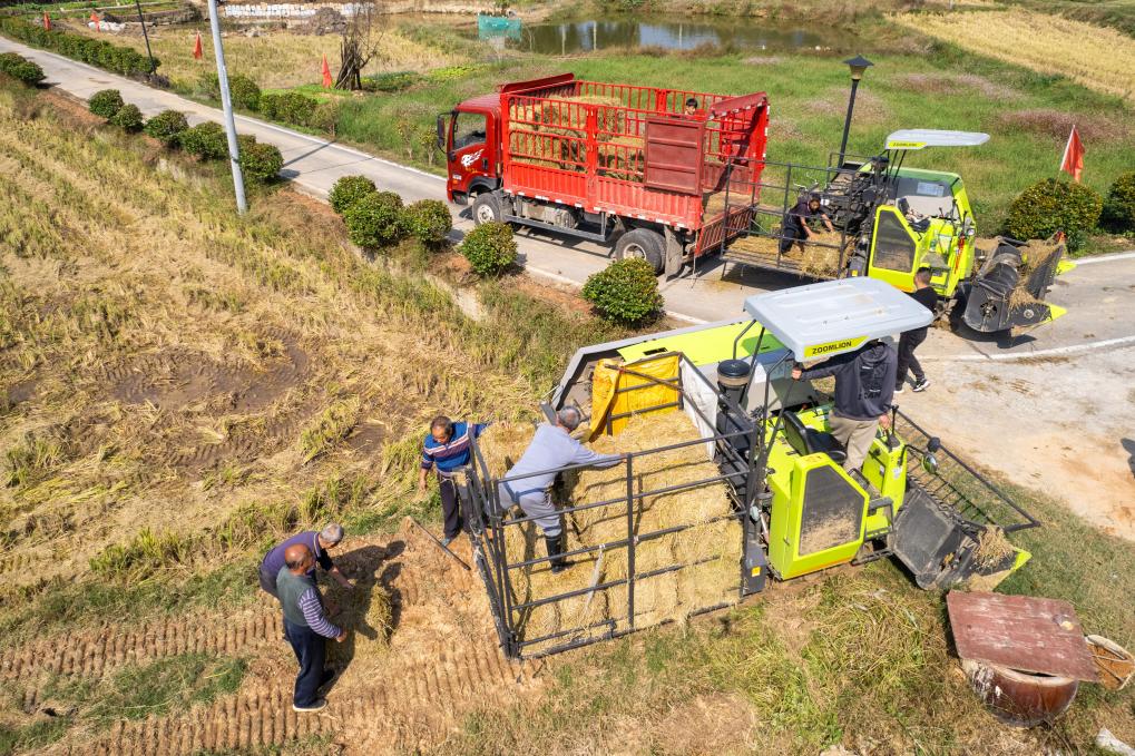 5日、長沙県開慧村で束ねた稲わらを運ぶ村民。(ドローンから、長沙=新華社記者/陳思汗)