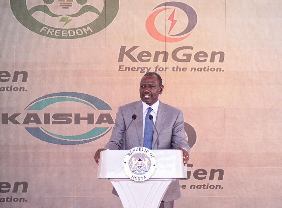 3日、ケニアのナクル郡で行われたプロジェクト起工式であいさつするケニアのルト大統領。(ナクル=新華社記者/李亜輝)