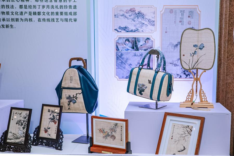 11日、「天工開物」円卓会議の会場に展示された無形文化遺産「夏布刺繍(ししゅう)」の作品。(北京=新華社配信)
