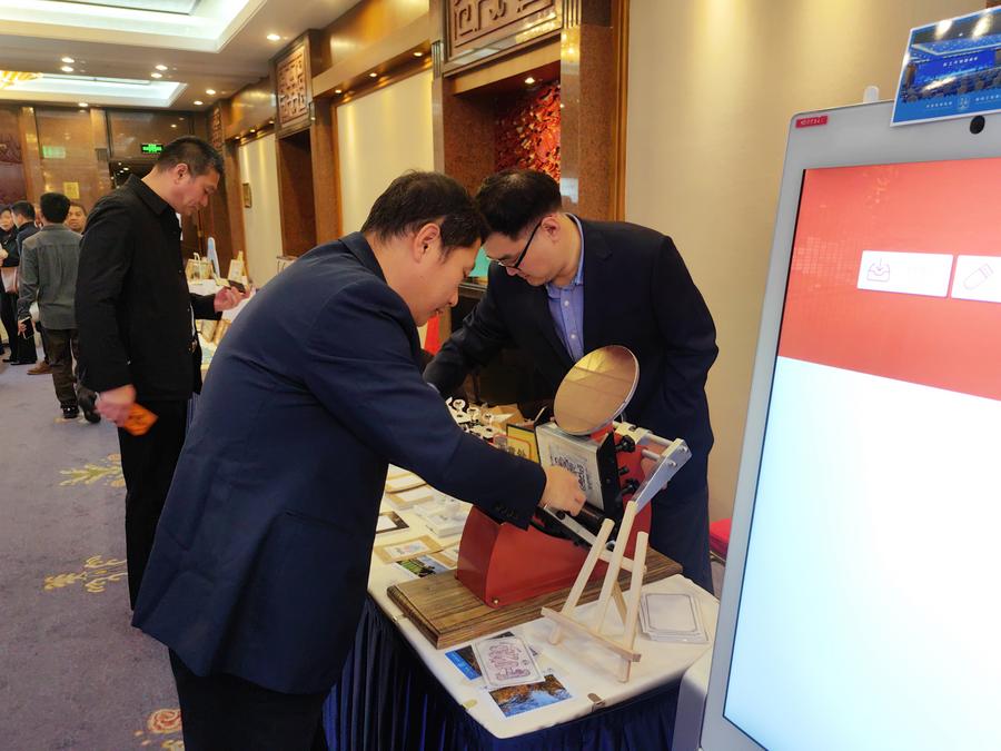11日、「天工開物」円卓会議の会場で、スタンプラリーに参加する会議出席者。(北京=新華社記者/呉寒氷)